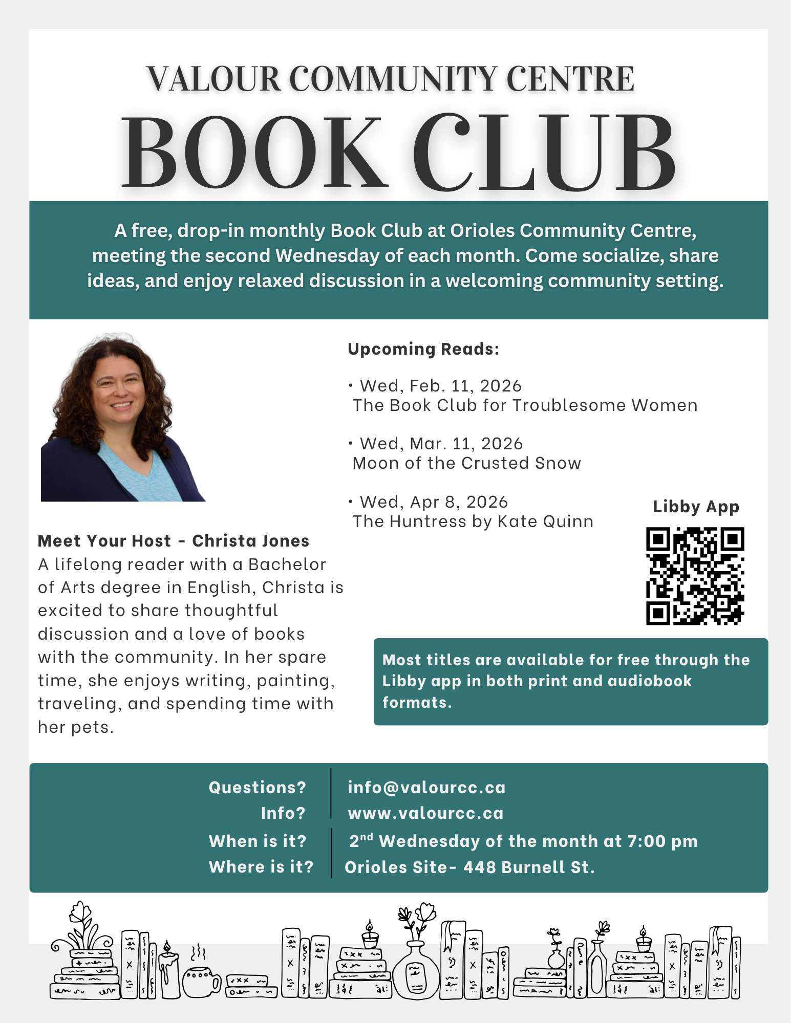 Our Book Club is hosted by Christa Jones, a lifelong reader with a Bachelor of Arts degree in English. Christa is passionate about fostering inclusive, engaging discussions and sharing a love of reading within the community.