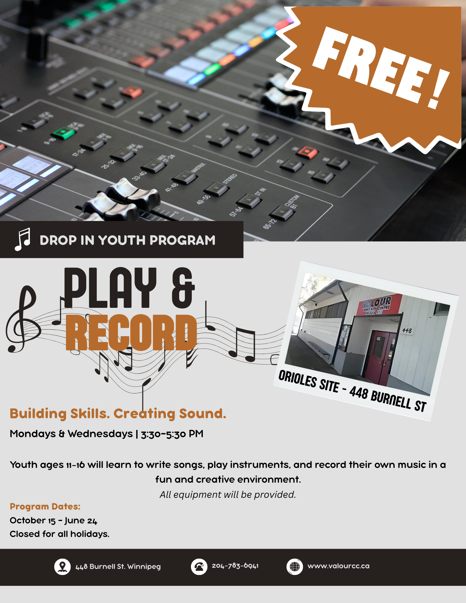 Unleash your musical creativity in this hands-on drop-in program! Youth will have the opportunity to write songs, play instruments, and record their own music in a welcoming and supportive space. No experience needed — all equipment is provided.