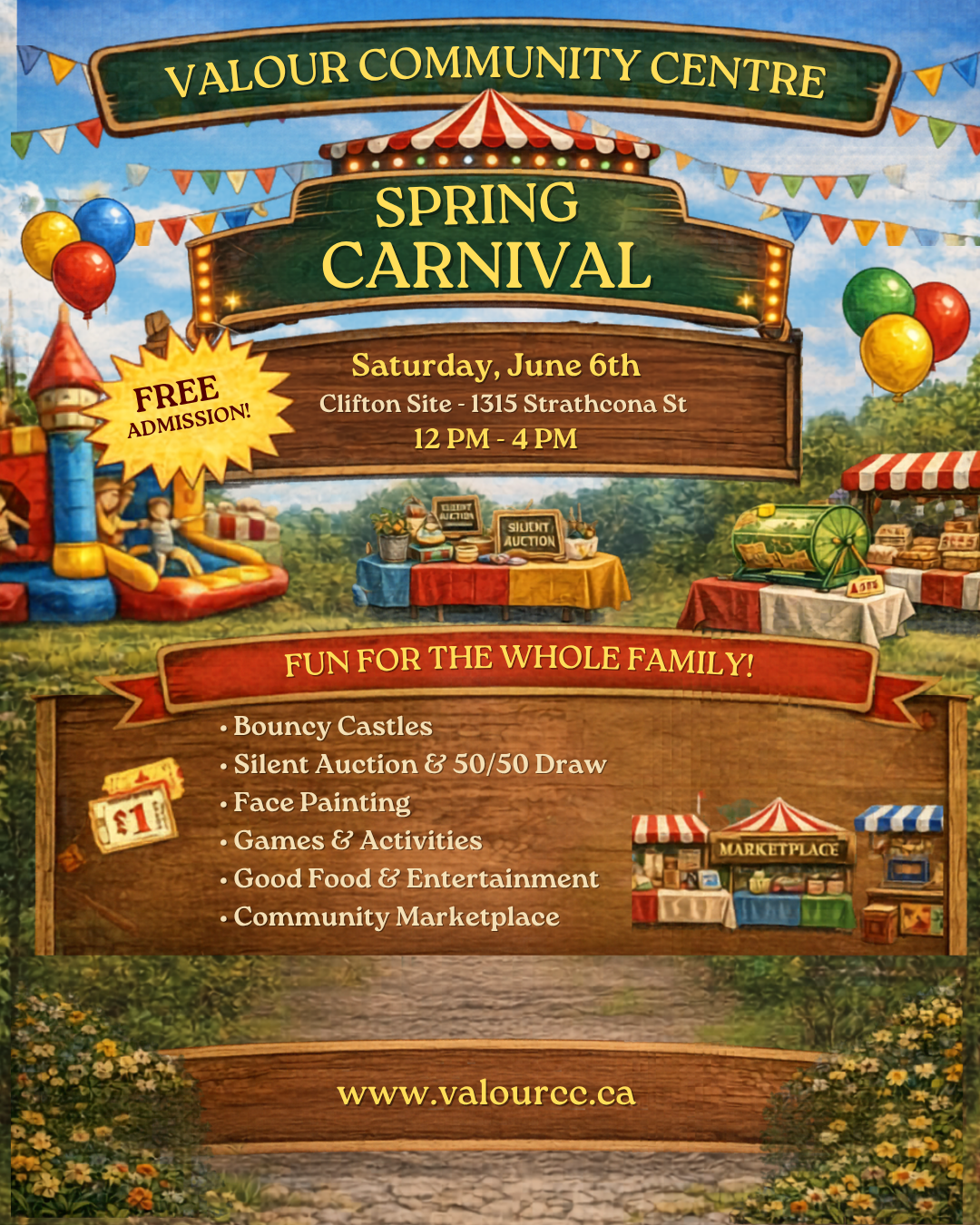Be part of Valour Community Centre’s Spring Carnival marketplace and connect with families, neighbours, and community members during this fun-filled event.